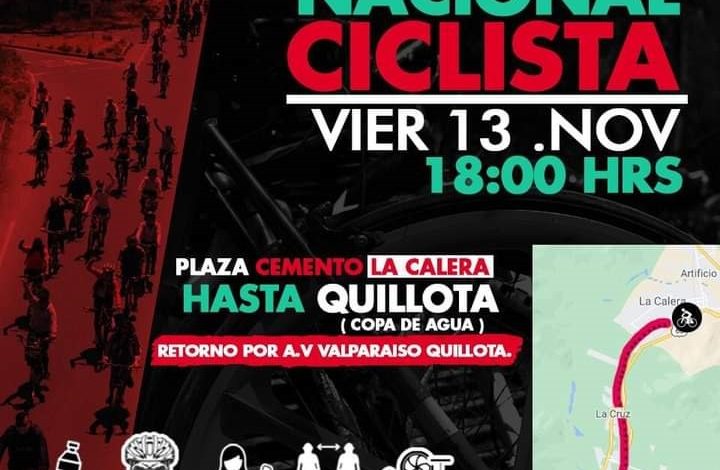 Los ciclistas caleranos se adhieren al Paro Nacional haciendo un llamado a reunirse hoy 13 de noviembre en la Plaza Cemento Melón a las 18:00 horas para movilizarse en dirección a la comuna de Quillota. Remarcan llevar sus implementos de seguridad (luz y casco ), bicicleta en buen estado, agua, mascarilla y alcohol gel.