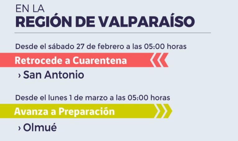 En un último reporte entregado por el Minsal sobre los cambios en el Plan Paso a Paso, en la Región de Valparaíso la comuna de San Antonio pasara a Fase 1 de Cuarentena y la comuna de Olmué avanzará a Fase 3, este último cambio será a partir del próximo lunes a partir de las 05:00 horas.