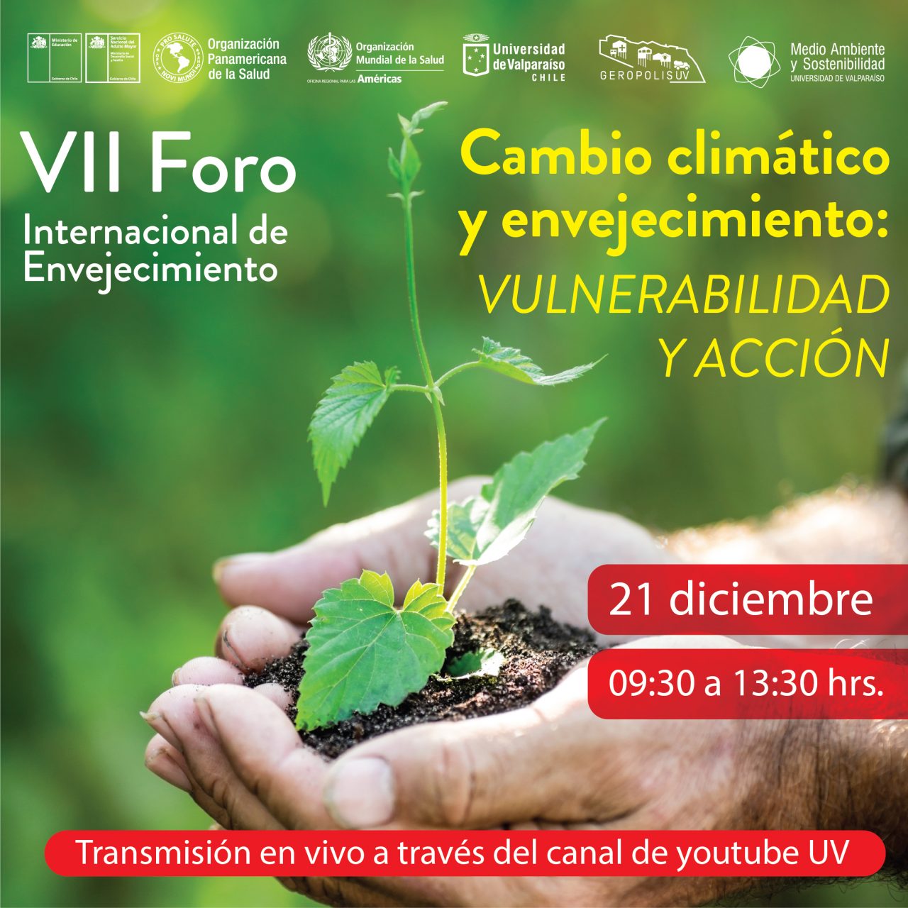 El VII Foro Internacional de Envejecimiento “Cambio climático y envejecimiento: vulnerabilidad y acción” se llevará a cabo el martes 21 de diciembre, de 09:30 a 13:30 horas, a través de una transmisión en vivo por el canal de Youtube de la UV (enlace directo: https://youtu.be/Ull51QPtDKw). El programa del evento está disponible en el sitio web https://geropolis.uv.cl/images/foro2021.pdf, y para recibir un recordatorio, es necesario registrarse en el formulario en línea https://forms.gle/quvBH7AqQfkZ6xR2A.