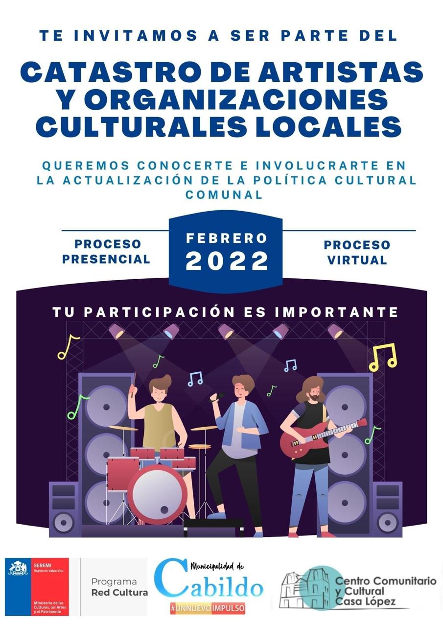 El municipio de Cabildo informó en sus redes sociales, la apertura de un proceso de consulta ciudadana, específicamente dirigida a los artistas locales de la comuna, “la Dirección de Deporte, Turismo, Cultura y Recreación de la Ilustre Municipalidad de Cabildo, en conjunto con la Seremi de las Culturas, las Artes y Patrimonio de la Región de Valparaíso, a través de su programa Red Cultura, te invitan a ser parte de este proceso que tiene por finalidad el conocer a quienes desempeñan actividades en las artes, el patrimonio y las distintas disciplinas del quehacer cultura”.