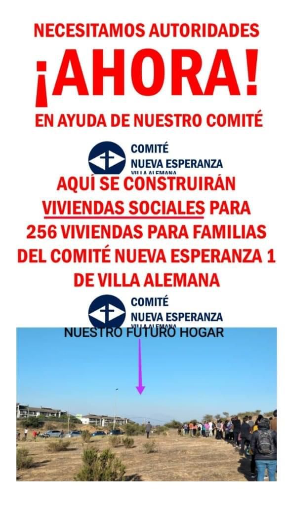 A tan solo un mes de postular, el comité “Nueva Esperanza” de Villa Alemana, se ve afectado porque 9 familias de inmigrantes realizaron tomas en el terreno que está destinado para la vivienda de 256 familia, según se relatan los acontecimientos “el día lunes 7 de febrero nuestro presidente se encuentra con la sorpresa de que 4 familias se encuentran cerrando y tomándose el terreno que forma parte de nuestro proyecto, el día de ayer ya eran 9 los cuales no pudieron ser desalojados por tener 3 niños en el lugar”, comenta Cynthia Soto.