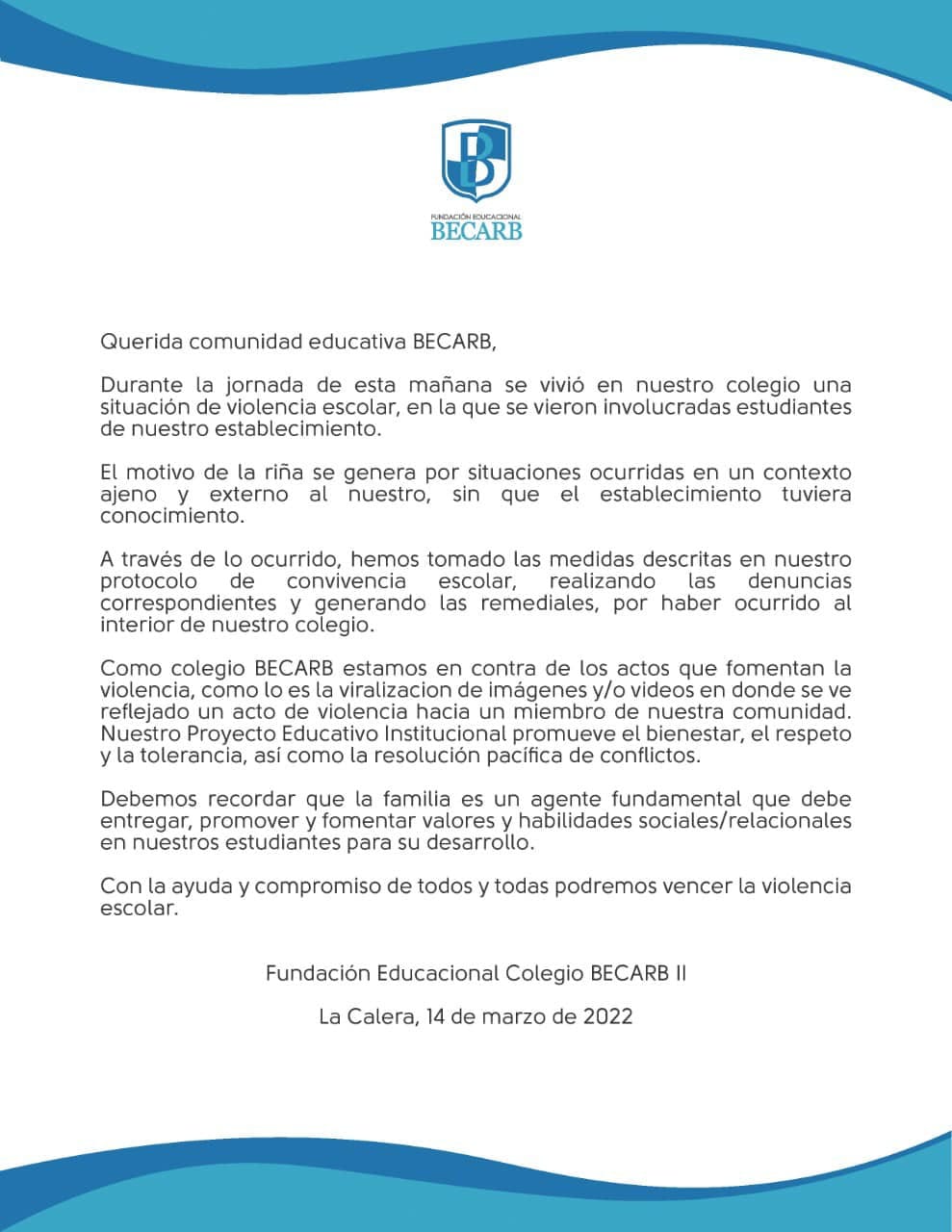 Las involucradas fueron llevadas a la Séptima Comisaría de La Calera. El colegio por su parte emitió un comunicado en el cual argumenta que este hecho es ajeno a las labores educacionales y son enérgicos en repudiar todo acto de violencia.