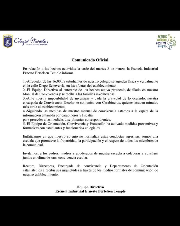 Hace una semana ocurrió lo mismo en Quillota, en las afueras del Colegio Diego Echeverría donde apoderados vieron como alumnos iban con palos y cuchillo en mano a amedrentar a otros.