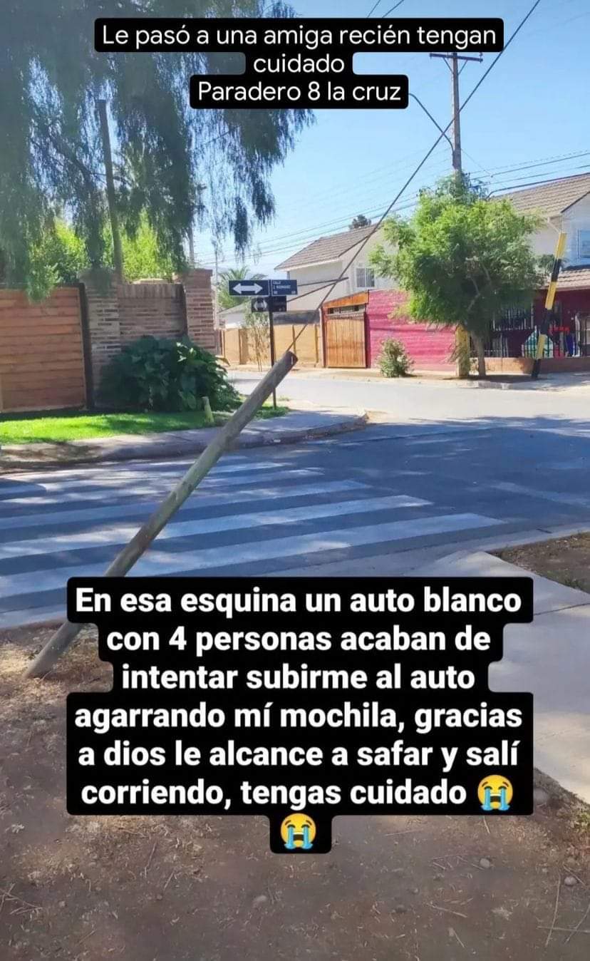 Un episodio de terror vivió una profesora en el límite de las comunas de Quillota y La Cruz, cuando una banda de 4 sujetos trató de subirla a la fuerza a un automóvil.