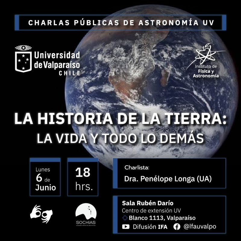 Esta charla que se titula “La historia de la Tierra: la Vida y todo lo demás” está a cargo de la astrónoma Dra. Penélope Longa-Peña de la Universidad de Antofagasta y es un paseo por la historia de la vida en la Tierra como la conocemos, partiendo con la creación de nuestro Sistema Solar y terminando en la era de la información.