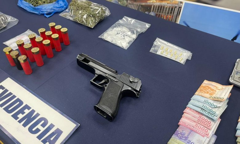 En la diligencia, se incautó 0,20 gramos de Cocaína base, 61,8 gramos de Cannabis, 21,81 gramos. Clorhidrato de cocaína, 10 comprimidos de clonazepam, 01 planta de cannabis, además de balanzas digitales para la dosificación de la droga. El avalúo total de las sustancias incautadas es de $ 581.000, además de $ 288.400 en dinero efectivo, además de 15 cartuchos de escopeta y una pistola a fogueo.