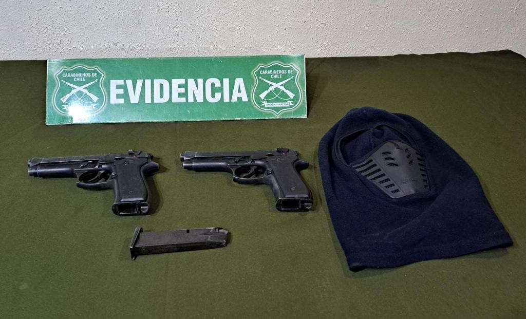 Además, se incautaron dos armas a fogueo modificadas para el disparo y un pasamontañas, y tanto las especies sustraídas del servicentro como el auto robado en el que se transportaban fueron recuperados.