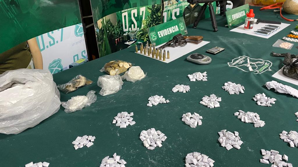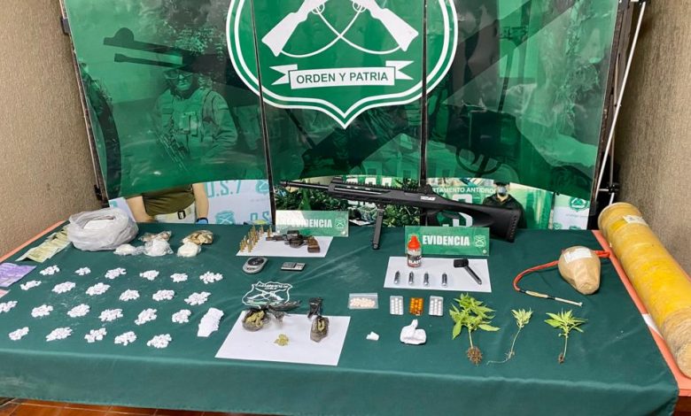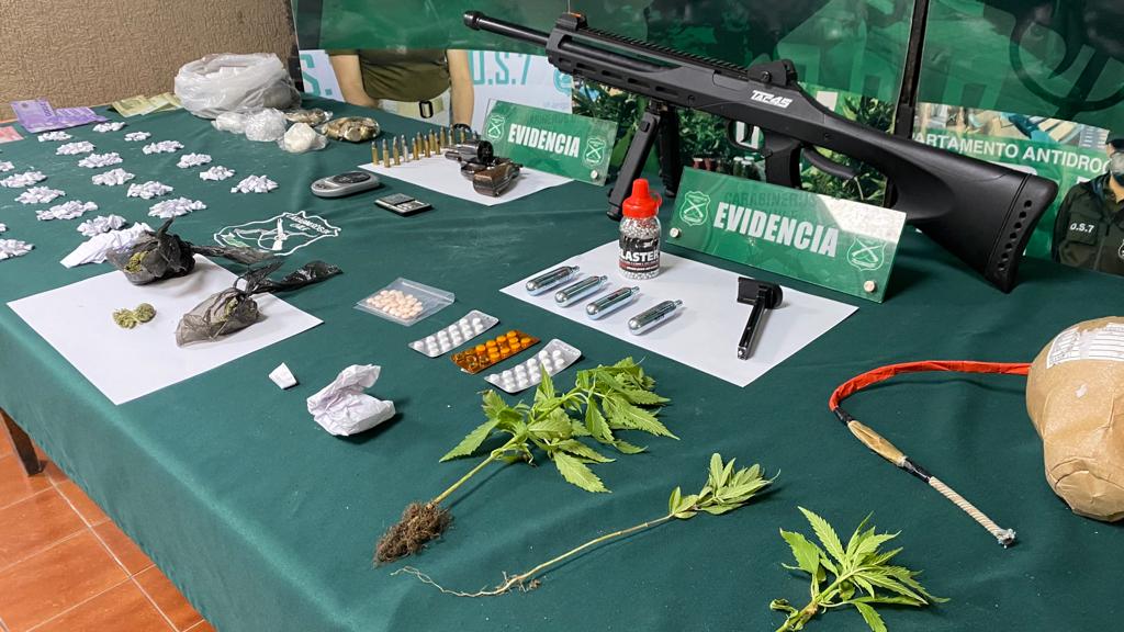 Además, se incautaron un revólver de fuego, un rifle de aire comprimido, fuego pirotécnico, pesas digitales y dinero en efectivo, entre otros elementos constitutivos de delito.