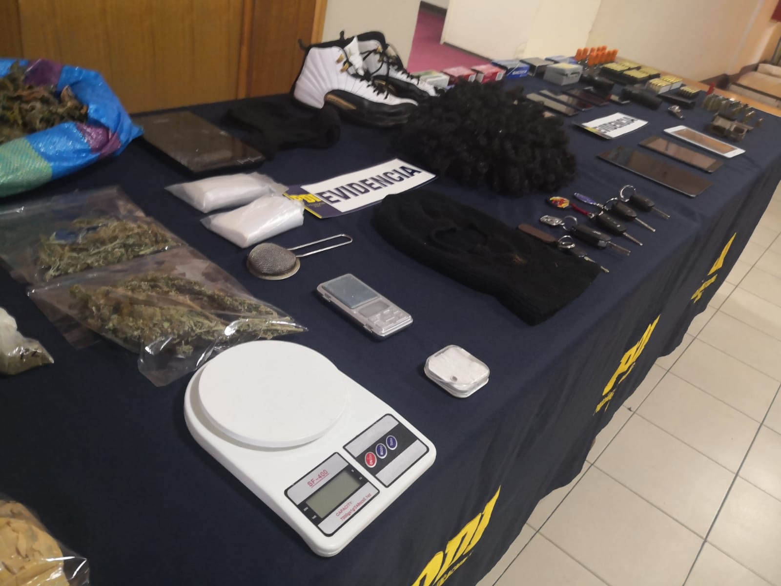 La policía civil incautó como parte de las diligencias, armas de fuego, pistola de aire comprimido, gran cantidad de municiones balísticas, una granada de fragmentación y más de 3 kilos 500 gramos de droga de diversos tipos.