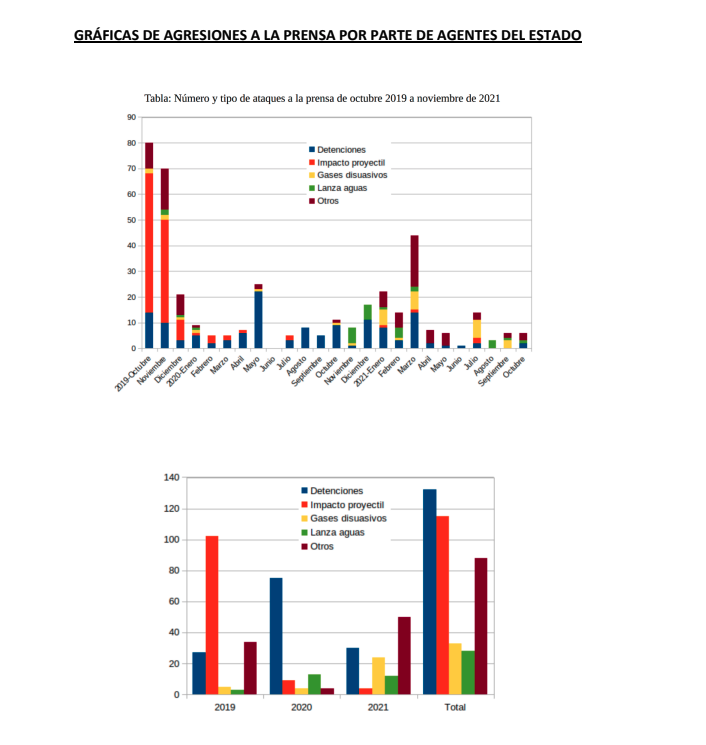 Según los datos recopilados, desde octubre de 2019 hasta noviembre de 2021 se contabilizaron 403 ataques contra la prensa, a través de amenazas e intimidaciones contra periodistas, comunicadores/as, fotógrafos/as y medios de comunicación. La mayoría de las agresiones y actos de hostigamiento ocurrieron cuando las y los trabajadores se encontraban realizando cobertura informativa de las protestas y fueron cometidas principalmente por funcionarios de Fuerzas Especiales.