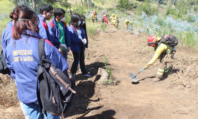 En el fundo Quebrada Verde de Valparaíso, por invitación del Consejo de Rectores de las  universidades tradicionales, brigadistas y prevencionistas de Conaf capacitaron a estudiantes en torno a la construcción de cortafuegos y técnicas de manejo de combustibles vegetales.