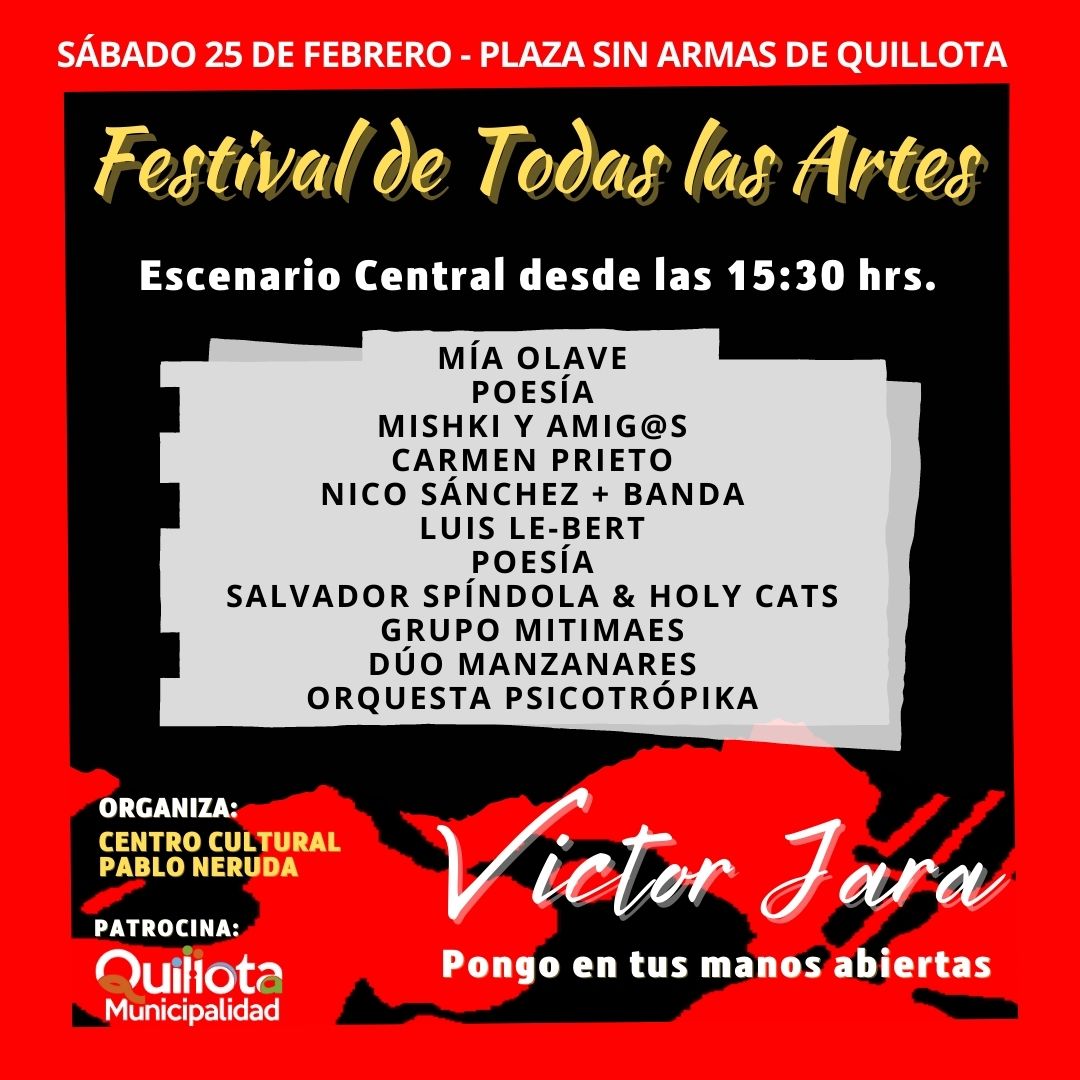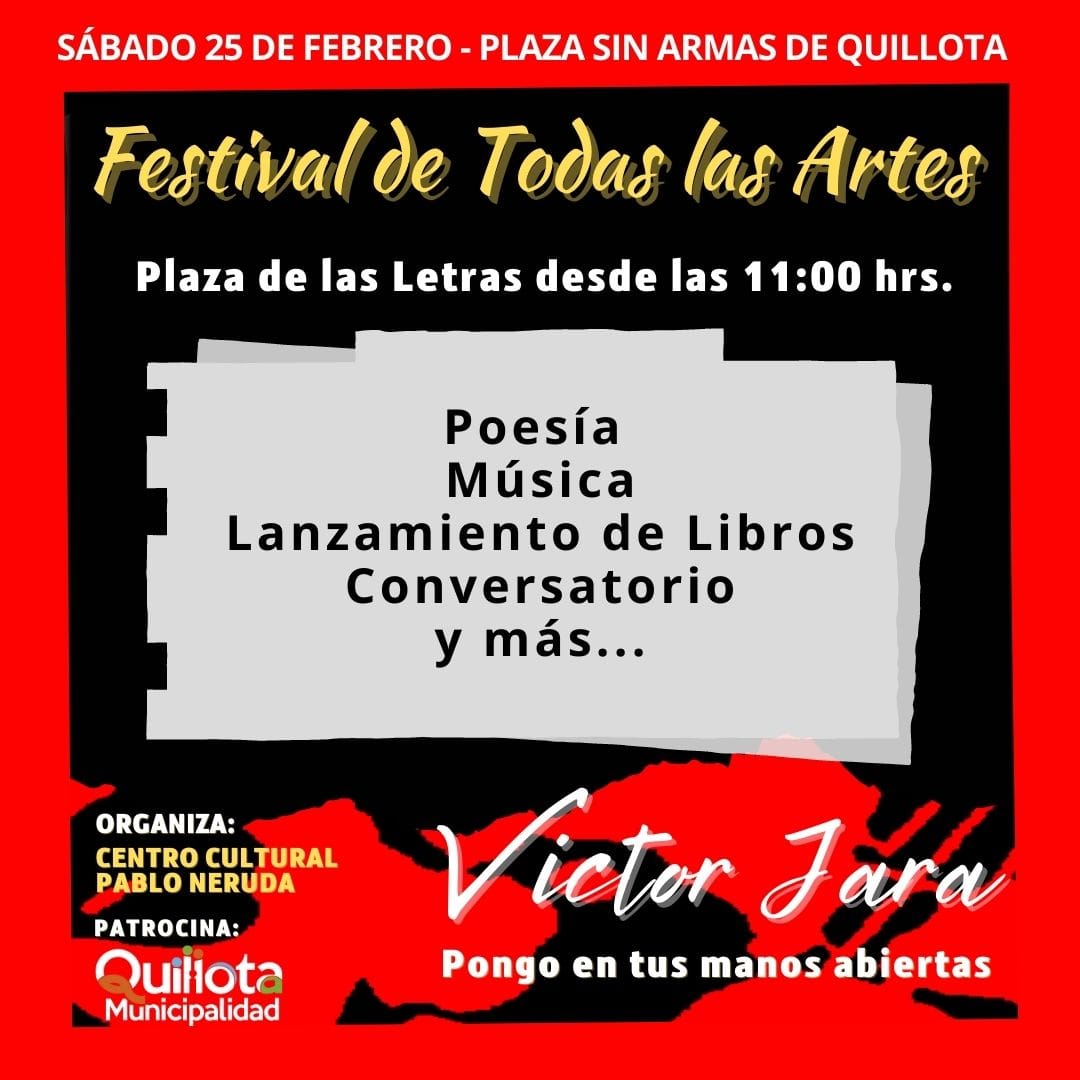 Patricio Cruz, del Centro Cultural “Pablo Neruda”, comentó que “este sábado vamos a honrar la vida y obra de Víctor Jara en el Festival de Todas las Artes, un hito ya de los veranos en Quillota hace largos años. Nos encontraremos con el teatro, la música, las canciones, la poesía, los libros, el arte liberador, ese arte que Víctor moldeó como nadie en la arcilla que su propio pueblo le fue proporcionando. En los 50 años de su asesinato, le rendimos todos los homenajes y todos los honores que merece”.