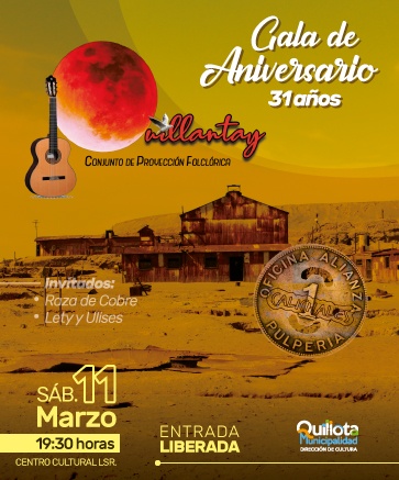 Este sábado 11 de marzo, a las 19:30 horas, en el Teatro Rodolfo Bravo del Centro Cultural Municipal Leopoldo Silva Reynoard, se realizará la gala aniversario del Conjunto de Proyección Folclórica Quillantay, la cual consta de una cantata que lleva por nombre “Calichale”.