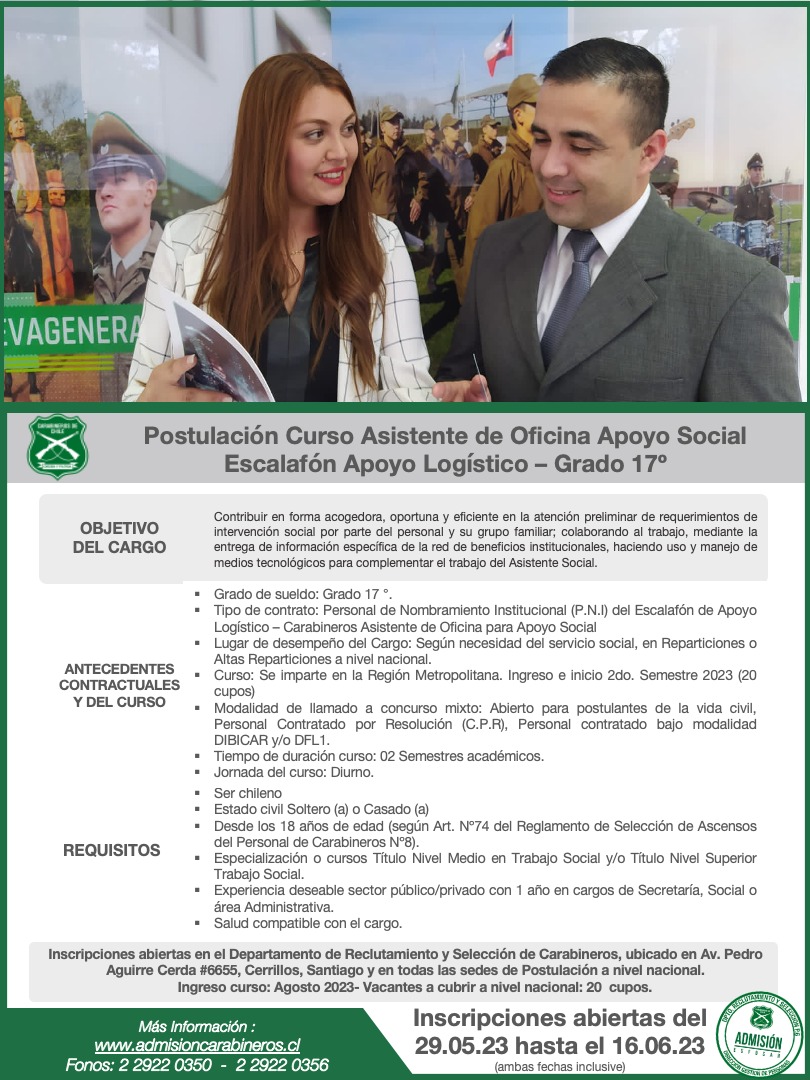 La Oficina de Postulaciones de la Prefectura de Carabineros Aconcagua anunció que el Departamento de Reclutamiento y Selección de la entidad policial extendió el período de admisión para postular a Asistente de Oficina para Apoyo Social hasta el viernes 16 de junio.