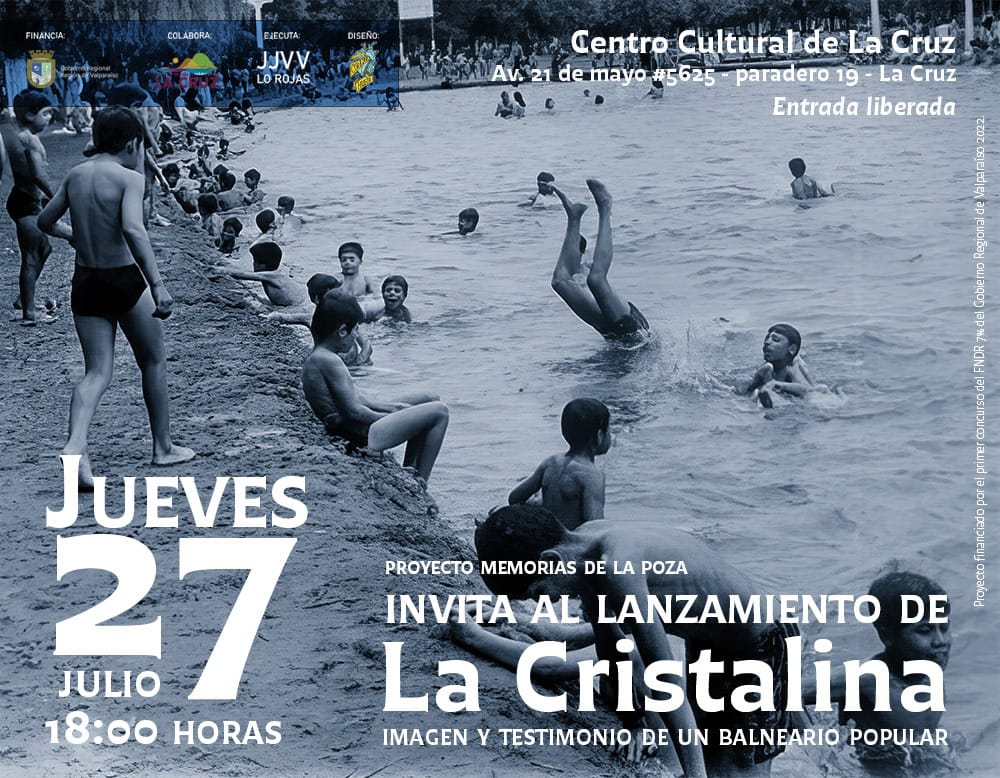 El jueves 27 de julio se lanzará “La Cristalina. Imagen y testimonio de un balneario popular”, un fotolibro que recoge las voces y fotografías de quienes pudieron disfrutar de este lugar. La actividad es gratuita y se desarrollará en la Casa de la Cultura de La Cruz, ubicada en el paradero 19, a las 18:00 horas. En la oportunidad se regalarán ejemplares a quienes asistan. Este proyecto es impulsado por la Junta de Vecinos de Lo Rojas en conjunto con la editorial Corazón de Hueso.