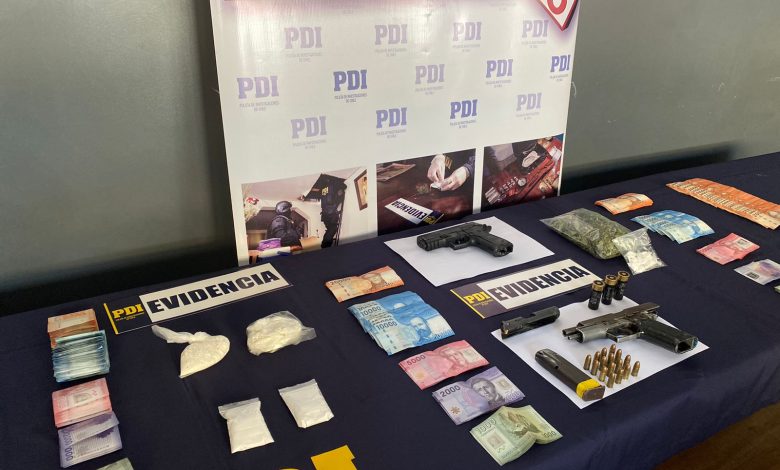 El trabajo de análisis criminal e inteligencia policial desplegado por los efectivos de la PDI permitió conseguir órdenes de entrada y registro para seis domicilios ubicados en el sector alto de la Ciudad Jardín más otro en Villa Alemana, desde donde fueron incautadas dos pistolas, munición, 132 gramos de clorhidrato de cocaína; 3,71 gramos de cocaína base; 51,78 gramos de cannabis sativa; más de 3 millones de pesos en efectivo y diversos medicamentos que se encuentran sancionados por la Ley 20.000.