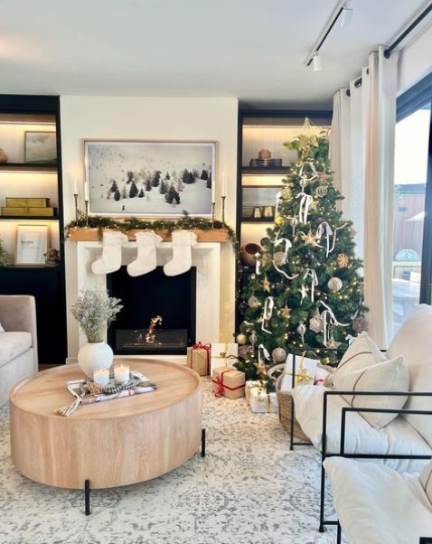 Regla 60-30-10: Se recomienda aplicar la regla del 60-30-10 para la paleta de colores. El 60% debe ser el color dominante, el 30% un color secundario y el 10% un color de acento. Para la Navidad, se puede optar, por ejemplo, por el verde (60%), blanco (30%) y dorado o plateado (10%) y distribuir estos colores en la decoración, como las esferas del árbol, las guirnaldas y las luces.