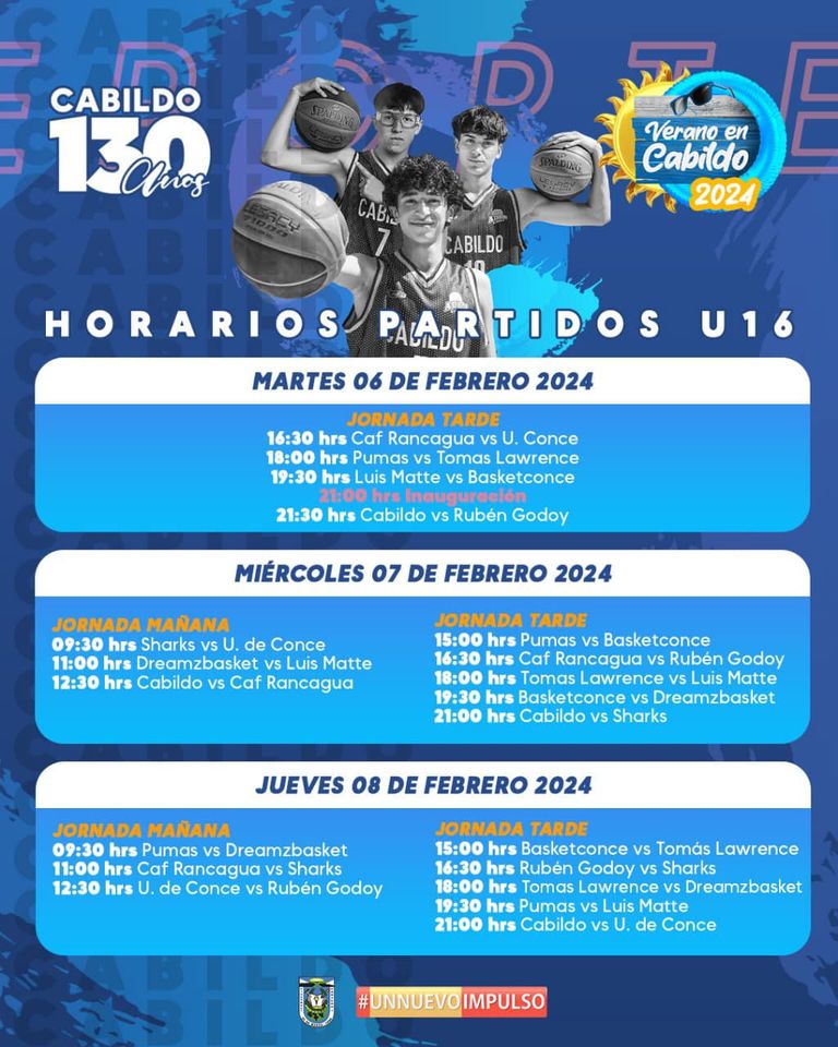 Las delegaciones de todo el país ya se instalaron en Cabildo para el Campeonato Nacional de Básquetbol Varones U-16 Copa “130 años ciudad de Cabildo”, el cual comienza hoy martes 06 de febrero en el Gimnasio Municipal, a las 16:30 horas.