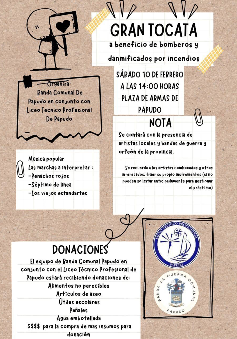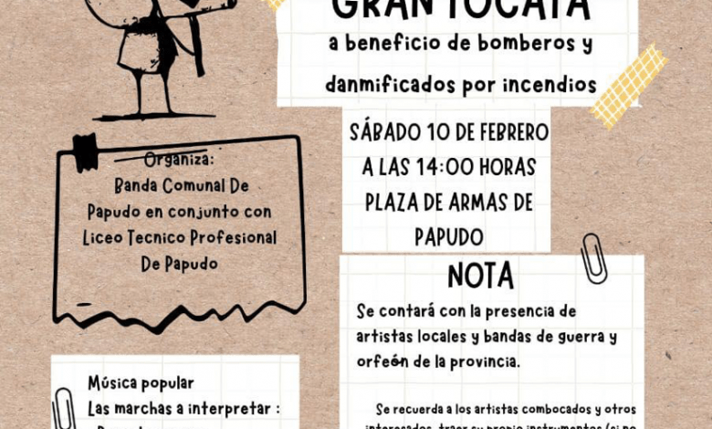 Una tocata a beneficio de bomberos y damnificados por el incendio  se realizará este sábado 10 de febrero, a las 14:00 horas, en la Plaza de Armas de Papudo.