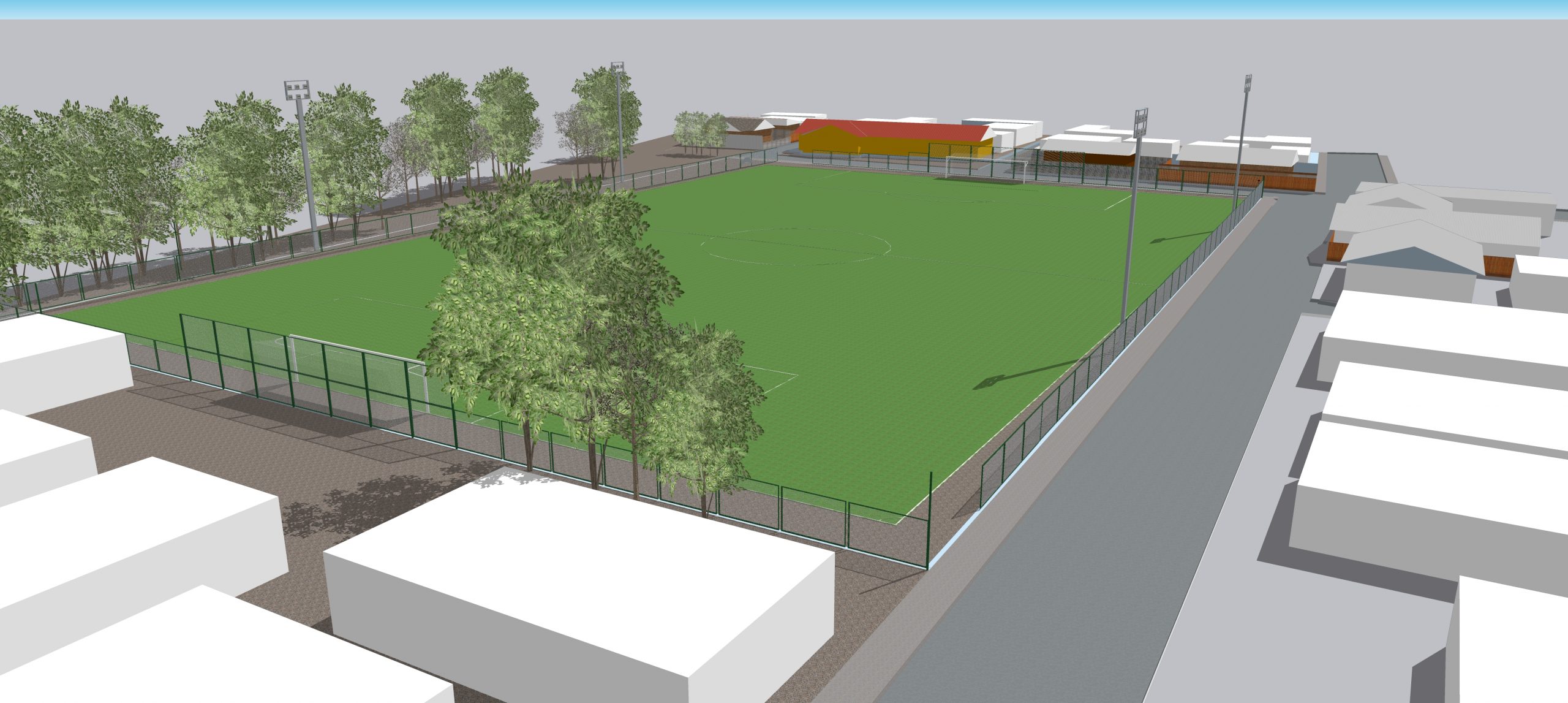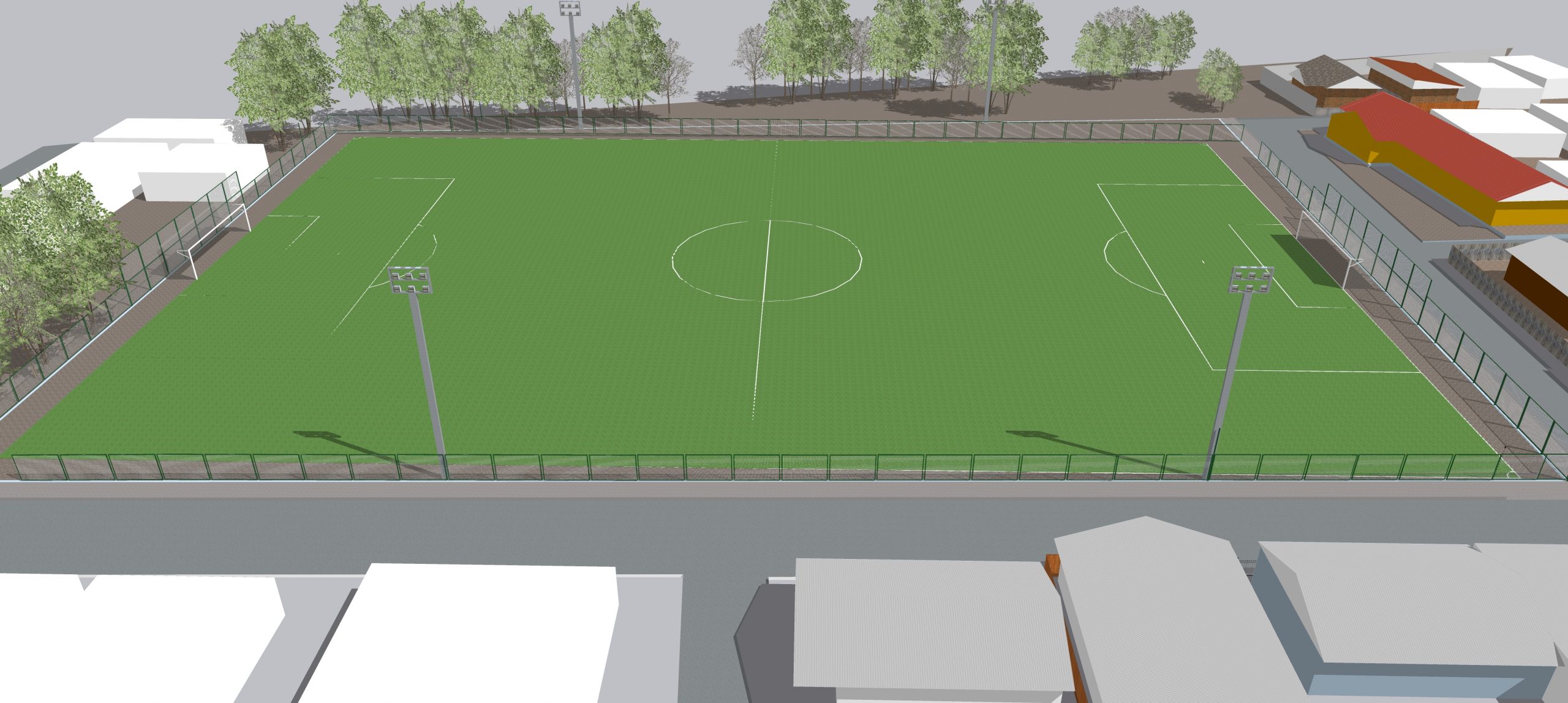 La iniciativa consiste en la reposición de cierre perimetral completo de la cancha con dos accesos equivalentes a 902,54 m2 aprox, hechos de malla Acmafor 3D alrededor de la cancha (2,5 mts altura) y malla Nylon en la parte superior de arcos (2,5 mtrs altura adicional). Instalación de 4 Torres completas (15,0 mts altura) con parrilla adaptable para 7 luminarias LED con capacidad de 500 wts c/u.