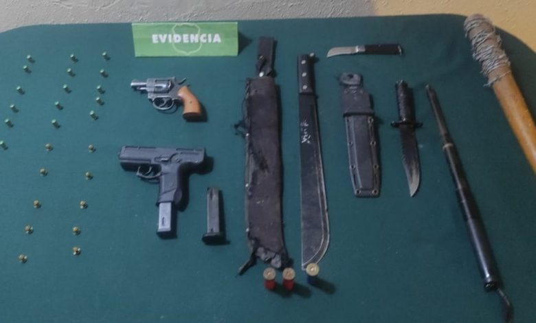 En este procedimiento policial, Carabineros encontró en el interior del móvil dos armas a fogueo, diferentes municiones, un machete, dos cuchillos, un bastón retráctil y un bate con alambre de púa adosado en su punta.