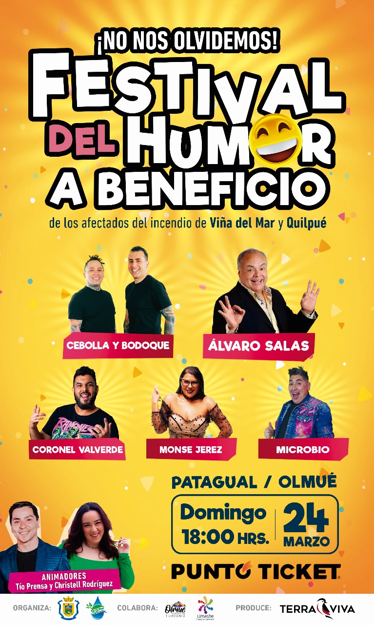 Por su parte el humorista nacional Álvaro Salas hace un llamado a no olvidarse de los damnificados de los incendios “Los invito a llenar el Patagual de Olmué el domingo 24 de marzo, en el festival del humor y el amor, donde compartiré el escenario con otros humoristas teniendo una noche de amor, humor y generosidad”