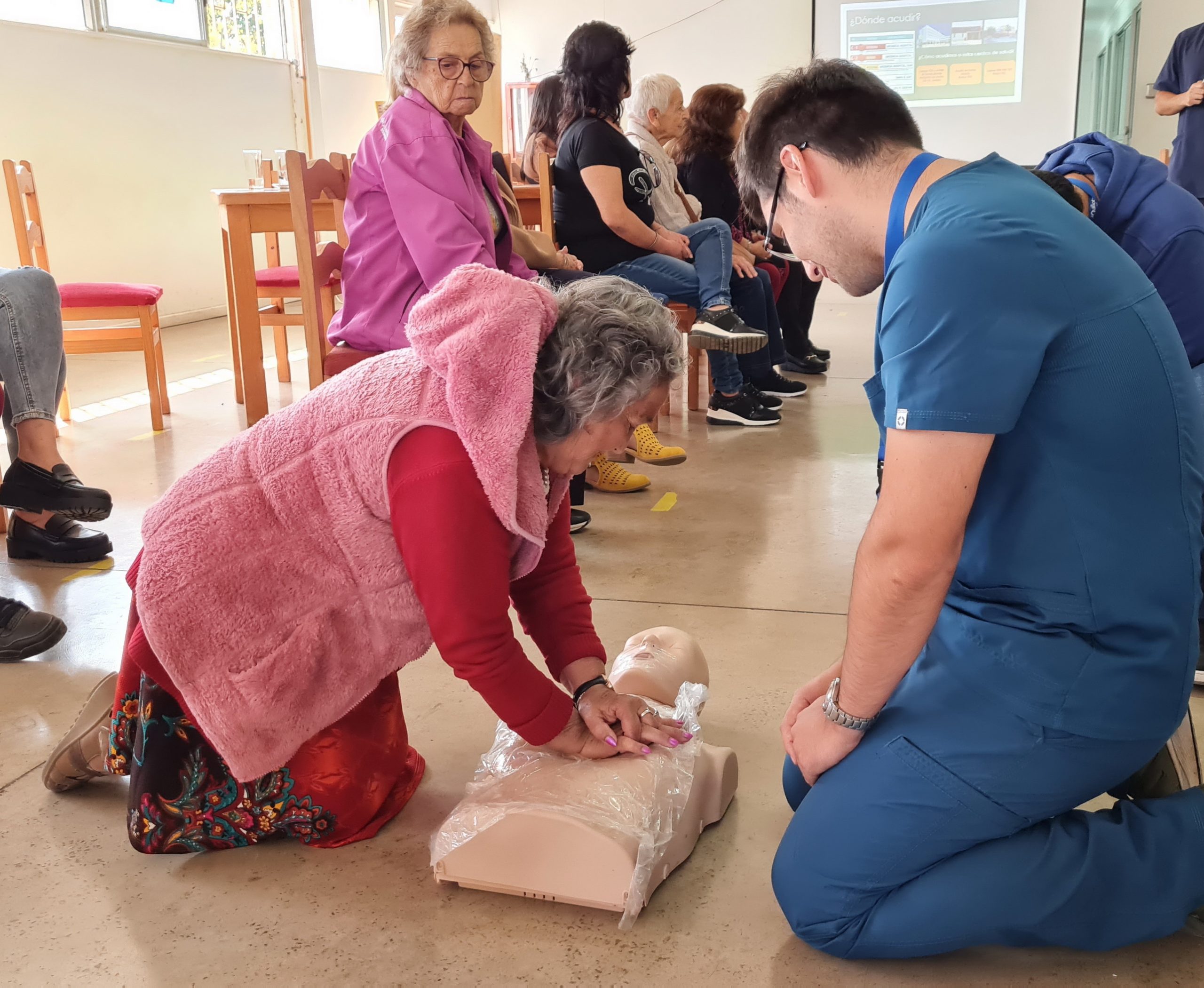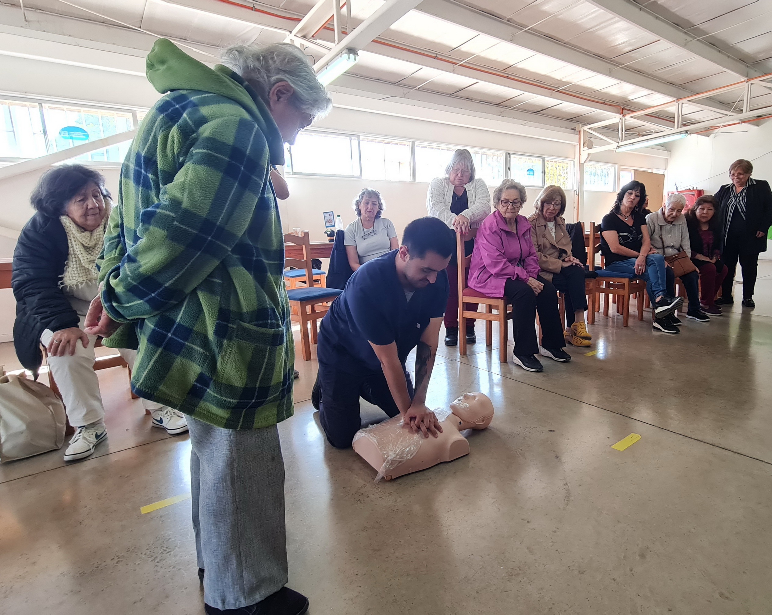 “El objetivo es enseñar a los adultos mayores, como reaccionar ante ciertas situaciones de emergencia vital, para que tengan herramientas para enfrentar estas situaciones de las cuales nadie está exento. Se abordaron temas como desmayo, hipoglucemia, maniobra de Heimlich y Reanimación cardiopulmonar (RCP), que son algunas cosas generales que siempre es bueno que lo sepan las personas para manejo inicial de ciertas situaciones”, explicó el médico EDF Ignacio Pérez.
