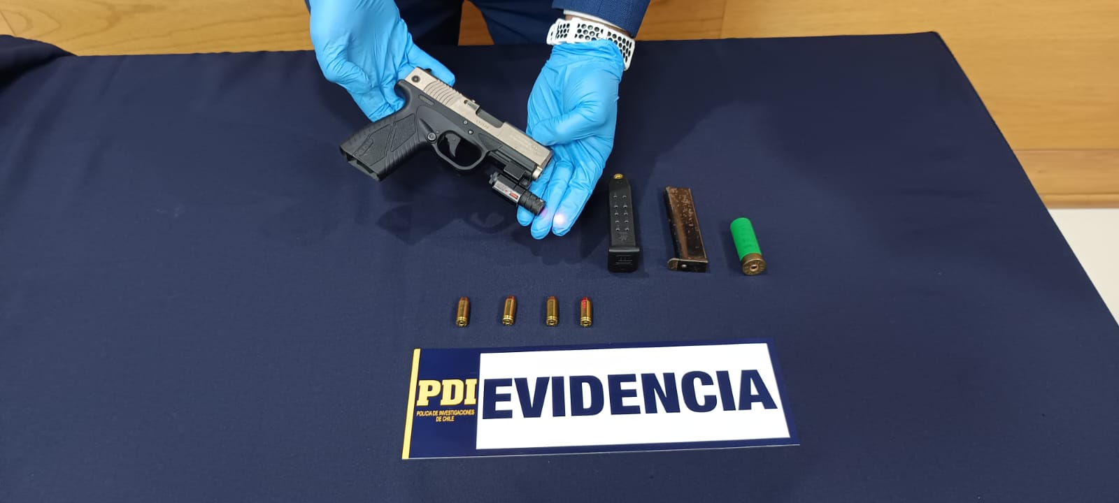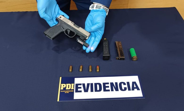 Según lo señaló el jefe de esta unidad especializada, subprefecto Andrés Honorato, “en cumplimiento a una orden judicial de entrada y registro, los detectives irrumpieron en una parcela del sector de San Juan, oportunidad donde encontraron diversos elementos balísticos, entre ellos una pistola calibre 9mm, con una mira laser incorporada, cinco cartuchos punto 40, además, de un cartucho calibre 12 para escopeta, todos sin percutar”.