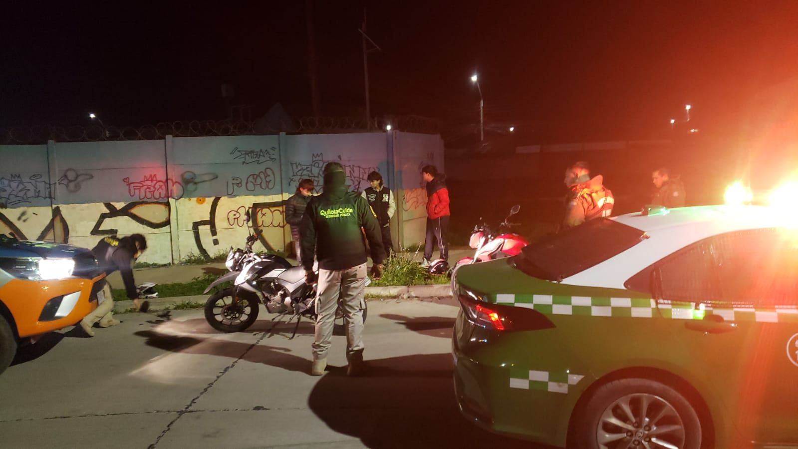 Un llamado a la central telefónica de Quillota Te Cuida permitió alertar a los patrulleros de una carrera de motos a un costado de la Villa El Alba, por lo que de inmediato el móvil 19 se dirigió al lugar y pilló de manera in fraganti a cuatro motocicletas, de los cuales dos se alcanzaron a dar a fuga, pero los otros dos conductores fueron sorprendidos sin portar licencia de conducir.