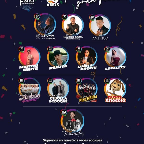 De esta manera, la Expo Quillota 2025 no solo reunirá a grandes figuras nacionales e internacionales, sino que también será una vitrina para nuestros talentos locales, quienes aportan identidad, diversidad y raíces a cada jornada. La presencia de dos escenarios busca precisamente eso: que el público pueda disfrutar de un recorrido cultural amplio, desde la música popular hasta las expresiones artísticas de la comuna. Cada día será una verdadera fiesta pensada para toda la familia, con espacios de encuentro, gastronomía, entretención y, por supuesto, mucha música en vivo. El escenario Cultural partirá desde las 17:00hrs y culminará a las 20:00 hrs durante los cuatro días.