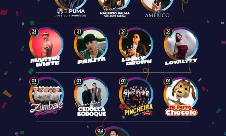 La tercera noche, el 1 de noviembre, arrancará con la energía de Los Pincheiras del Sur, un grupo nacional con 15 años de trayectoria y éxitos como “Escápate Conmigo”. Luego, el dúo humorístico Cebolla y Bodoque, integrado por Adrián Correa y Diddier Marín, hará reír a todos los asistentes con su especial sentido del humor. Para los más pequeños, habrá una presentación del popular Perro Chocolo, entre otras sorpresas.