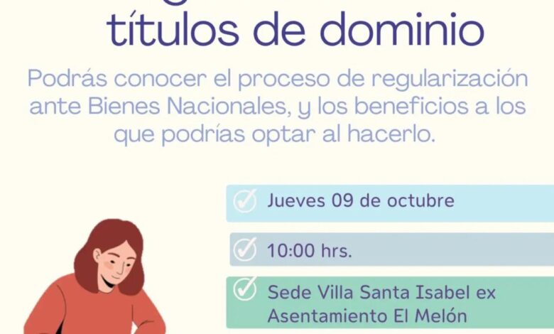 En la Sede de la JJVV Villa Santa Isabel de El Melón, se desarrollará un taller informativo sobre el procedimiento de regularización de títulos de dominio, actividad organizada por la Oficina de la Mujer, el Programa Mujeres Jefas de Hogar y la Oficina de Vivienda, en colaboración con el Ministerio de Bienes Nacionales.