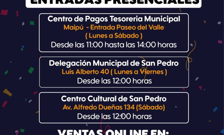 - Centro de Pagos Tesorería Municipal (Maipú 335, acceso por Paseo del Valle): lunes a sábado, 11:00 a 14:00 horas.