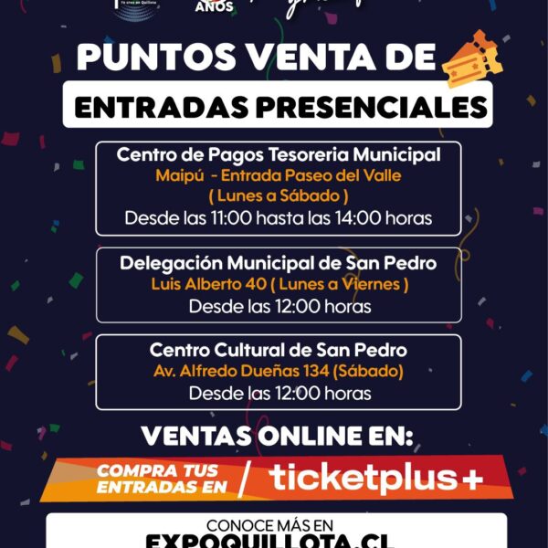 La Municipalidad de Quillota habilitó tres lugares para la venta presencial de tickets de la Expo Quillota 2025 —que celebra sus 25 años— y mantiene la venta online en Ticketplus.
