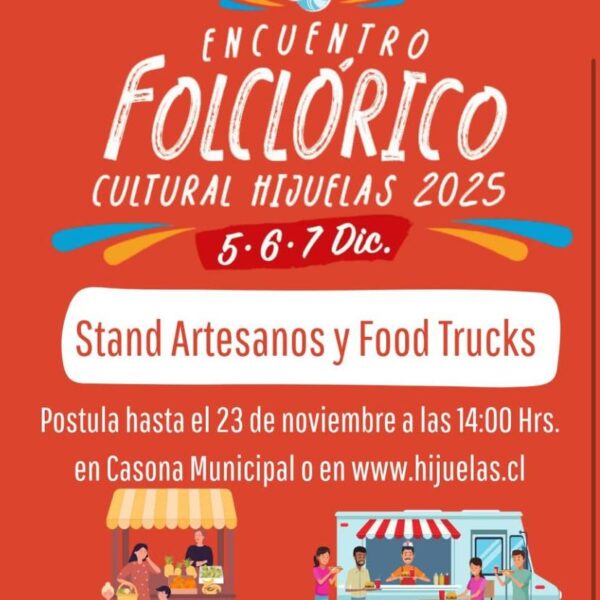 La Municipalidad de Hijuelas inició el proceso de postulación para artesanos, expositores y food trucks que deseen participar en el Encuentro Folclórico Cultural Hijuelas 2025, evento programado para los días 5, 6 y 7 de diciembre en el Parque Los Naranjos.