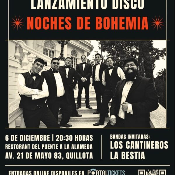 Tras seis años de exitosa trayectoria en distintos escenarios, la banda Quillotana Fiesta Bohemia se complace en anunciar el lanzamiento de su primer material discográfico: “Noches de Bohemia”. El evento de lanzamiento será el próximo sábado 6 de diciembre a las 20:30 horas en el Restaurant del Puente a la Alameda, ubicado en Av. 21 de Mayo 83, Quillota.