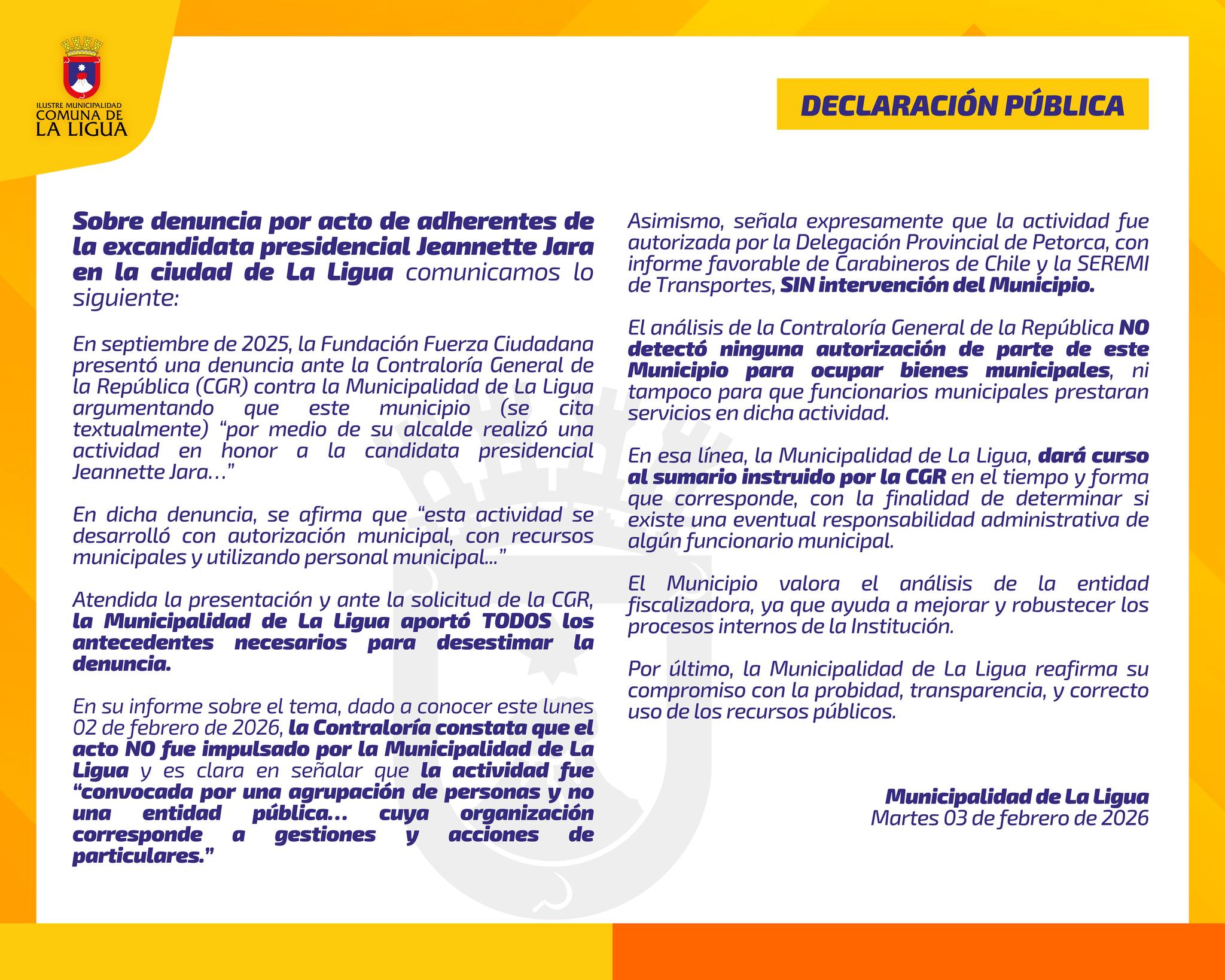 La Municipalidad de La Ligua salió a aclarar su rol en la actividad realizada en septiembre de 2025 por adherentes de la entonces excandidata presidencial Jeannette Jara, luego de que la Contraloría General de la República diera a conocer su informe este lunes 2 de febrero de 2026.