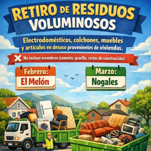 La Municipalidad de Nogales puso en marcha esta semana una campaña de retiro gratuito de voluminosos, iniciativa que busca apoyar la limpieza de los hogares y fortalecer el cuidado del entorno en las localidades de Nogales y El Melón.