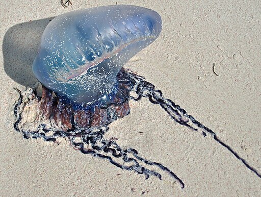 La fragata portuguesa se caracteriza por un flotador que puede alcanzar los 20 centímetros y tentáculos de hasta 20 metros de largo, con más de un millón de elementos urticantes por centímetro cuadrado. Es tóxica incluso cuando se encuentra muerta en la arena.