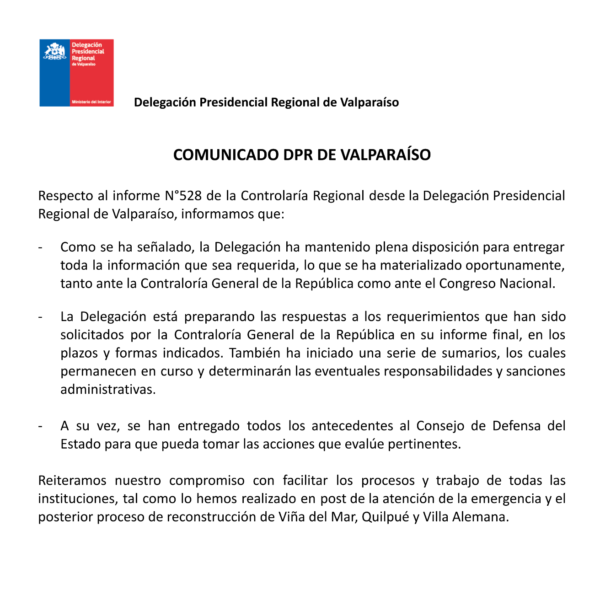 El pronunciamiento se da luego de que el ente contralor diera a conocer observaciones relevantes sobre el manejo de fondos por parte de la propia DPR, las municipalidades de Municipalidad de Viña del Mar y Municipalidad de Quilpué, además de la Dirección Regional de Arquitectura del MOP.