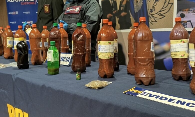 La investigación permitió detectar en el Paso Fronterizo Los Libertadores a un ciudadano brasileño mayor de edad que intentaba ingresar al país con 23 botellas de dos litros ocultas entre su equipaje. En su interior transportaba una sustancia líquida que, tras los peritajes de personal especializado de Aduanas y de la Brigada de Investigación de Sustancias Químicas de la PDI, fue identificada como una sustancia sicotrópica sujeta a control por la Ley 20.000.