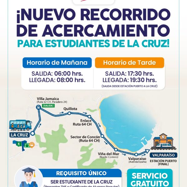 Además, precisó que el retorno se realizará durante la tarde bajo el mismo circuito: “El servicio comenzará desde las 17:30 horas, con un bus saliendo desde La Cruz que llegará hasta Valparaíso, para volver con los estudiantes a eso de las 19 horas, lo que permitirá cubrir la jornada completa de los estudiantes”, precisó Leyton.