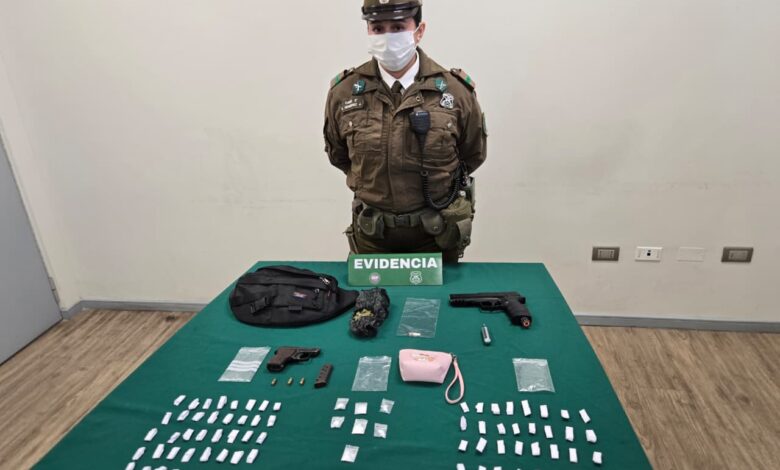 En su interior, Carabineros encontró una pistola marca Taurus con tres cartuchos balísticos calibre 6.35 sin percutar. Además, al revisar el automóvil, se incautó una pistola de aire comprimido con su válvula, 72 envoltorios de pasta base, siete envoltorios con cocaína, una bolsa con marihuana a granel y un cigarro de marihuana.